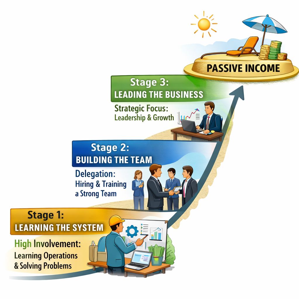 Instead, successful owners build operational knowledge first. Then they build teams, refine systems, and eventually shift toward leadership and growth.